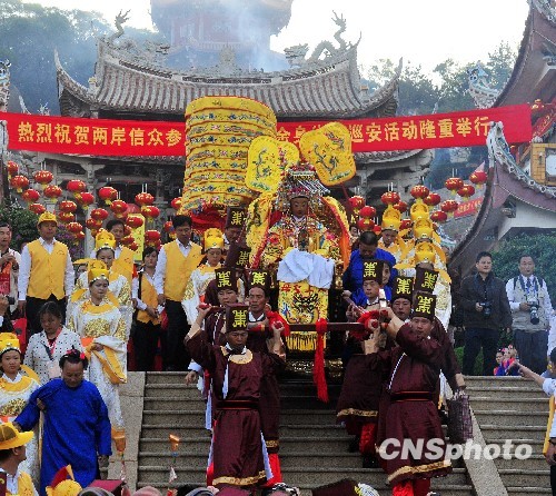 图为妈祖金身起驾巡安,钟鼓齐鸣、礼炮震天,场面极为壮观。中新社发 张丽君 摄