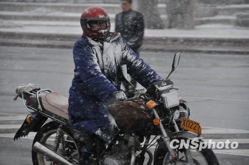 山东省乳山市市民在雪中行驶。中新社发 刘国贤 摄