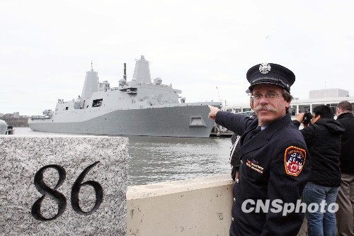 承载美国人“九·一一”沉重记忆的“纽约号”军舰,十一月二日上午首次驶抵纽约市,并停靠在紧邻退役航母“无畏号”的曼哈顿码头,等待正式加入美国海军编队服役。亲身经历“九·一一”恐怖袭击的纽约消防员琼·威尔森当天一早特地来到码头,希望一睹纽约号。他指着纽约号对记者表示,“我能感觉到世贸中心就在那里”。中新社发 魏晞 摄