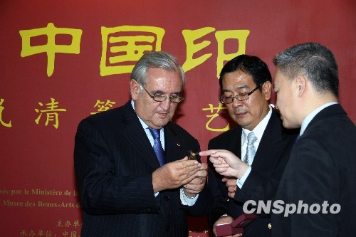 巴黎时间11月2日下午,法国前总理拉法兰(左一)来到位于塞纳河畔的巴黎中国文化中心,参观了正在那里展出的《中国印——李岚清篆刻艺术展》,对中国前副总理李岚清的艺术造诣及展览在促进法中文化交流方面的作用予以高度赞扬,并题词“法中友谊万古长青”。中新社发 吴卫中 摄