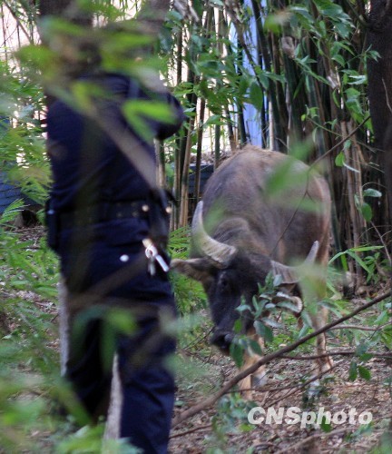 民警用手枪对发疯水牛进行近距离射击。中新社发 郭国权 摄