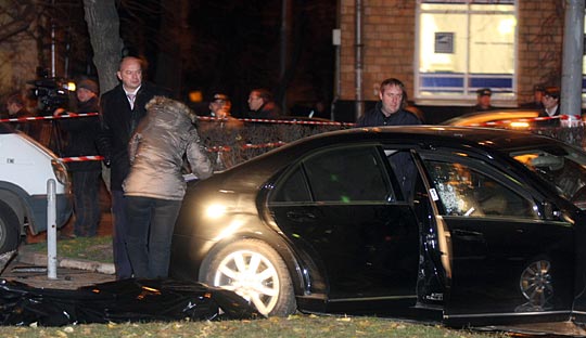 在俄罗斯首都莫斯科,专家们在沙伯泰·冯·卡尔马诺维奇被射杀的现场查看。