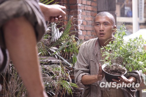 由陈可辛、黄建新监制,陈德森导演,甄子丹、王学圻、梁家辉、谢霆锋、胡军、曾志伟、李宇春、任达华、范冰冰、巴特尔、李嘉欣、黎明等16位帝后阵容出演的年度贺岁动作大片《十月围城》将于12月18日上映。拍片之前,谢霆锋因为“天然帅”而被陈德森勒令“彻底毁容”,在《十月围城》中,刀疤眼、半只耳、光脚的谢霆锋,让多次合作的范冰冰也直呼“做恶梦”!图为谢霆锋用一株盆栽调戏巴特尔,逗的“大块头”上蹿下跳。中新社发 李学仕 摄