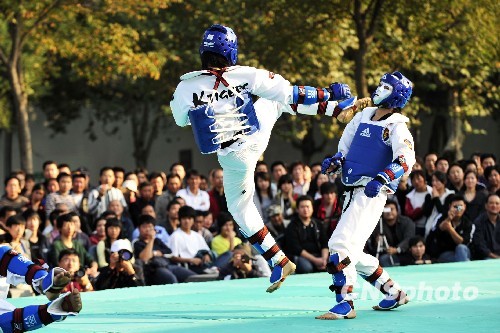 韩国跆拳道高手在杭展一显身手。中新社发 李忠 摄