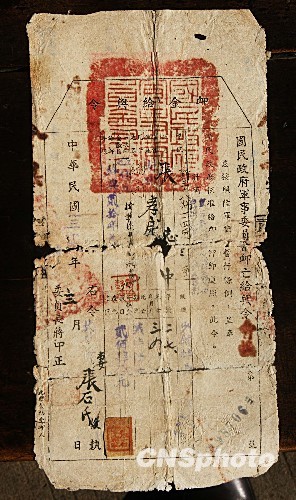 武汉发现蒋介石为抗日阵亡将士签署的抚恤令。中新社发 石苏一瑶 摄