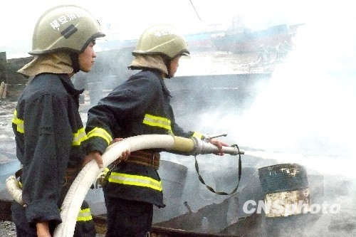 11月4日上午9时许,停泊在福建宁德市福安市赛歧镇樟港码头的一艘废船,因维修不慎引发火灾,造成10名维修工被困。接报后,福安市消防大队出动2辆消防车、17名官兵,展开2小时紧急救援,成功解救被困人员。中新社发 唐海波 摄