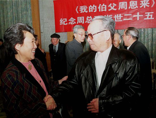 图为2001年1月8日,在纪念周恩来逝世25周年座谈会上,周恩来的侄女周秉德与谷牧(右)亲切交谈。中新社发 史利 摄