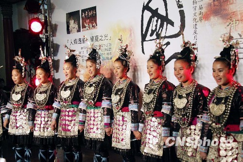 图为11月6日,贵州从江县女子侗族大歌队在于台北“国风――中华非物质文化遗产专场晚会”首演记者会上。中新社发 黄少华 摄