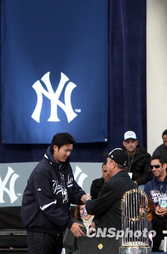 图为扬基队台北球员王建民从彭博手中接过城市钥匙。