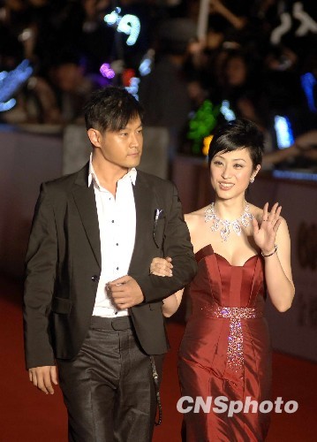香港影星陈法蓉和与伊能静传“牵手门”事件的黄维德携手亮相东南劲爆音乐榜星光大道。中新社发 王东明 摄