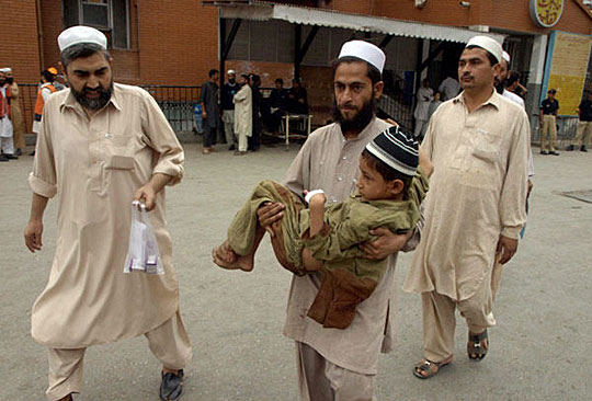 在巴基斯坦西北边境省首府白沙瓦,一巴基斯坦男子抱着在自杀式爆炸袭击中受伤的男孩离开医院。