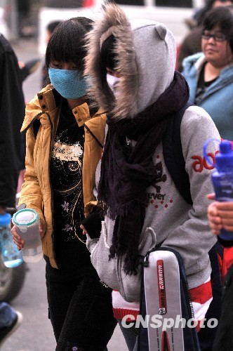 11月9日,受南下冷空气影响,河南省郑州市出现大风降温天气,许多出行市民和学生纷纷添衣保暖,抵御寒潮。中新社发 刘书亭 摄
