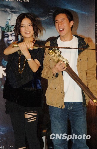 11月9日,云集了赵薇(左)、房祖名(右)、陈坤等演员的电影《花木兰》宣布公映时间为2009年11月27日。活动现场,赵薇获赠片方特制的20把木兰剑中编号为001的第一把宝剑,并在现场拨出 “木兰利剑”,以“木兰剑出鞘”的特殊形式宣告《花木兰》上映日程正式启动。中新社发 李学仕 摄