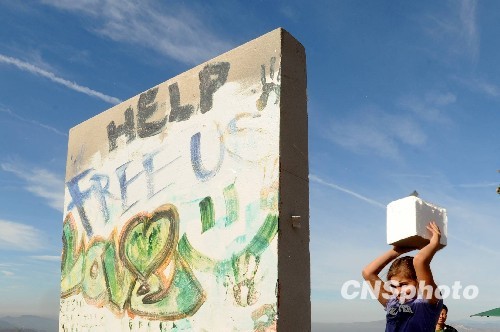当地时间十一月九日,美国里根总统图书馆举行柏林墙倒塌二十周年纪念活动,一群小学生正在拆除模拟柏林墙。