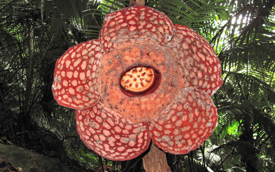 相关资料:1818年,自然学家约瑟夫·阿诺德和英国在新加坡殖民地的创建者托马斯·斯坦福德率领的科学探险队在印尼苏门答腊发现了这种植物,带有斑点的血红色花朵有7公斤重,直径一般1米以上,散发着一种腐烂尸体般的恶臭。它们每十五个月才开花一次,每次开花缺只绽放短短的7天。