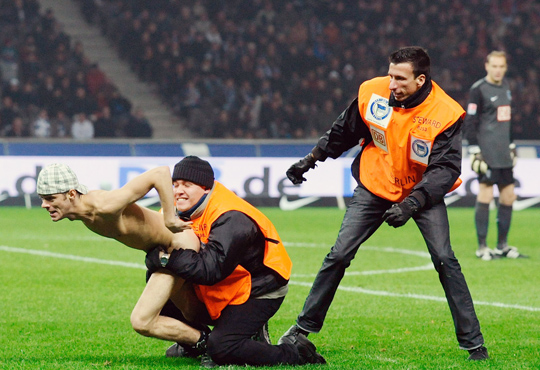图为一名愤怒的柏林赫塔球迷冲进球场内疯狂的裸奔。
