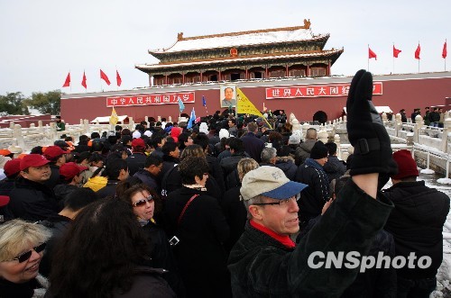 11月9日晚,北京迎来入冬之后最大的一场降雪。10日,大雪把天门城楼装点得更加美丽,到天安门旅游参观的国内外游客络绎不绝。中新社发 刘震 摄