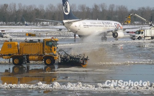 十一月十日凌晨开始,北京迎来今冬第二场大雪,北京首都国际机场积雪十五厘米。为了飞行安全,机场从一时五十分至六时零五分关闭跑道,二十三个航班被迫降至天津、石家庄及太原机场。 图为首都国际机场除冰机加紧清除积雪。中新社发 钱兴强 摄