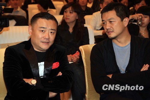 11月10日,内地著名演员李亚鹏(右)在上海“闪电”般地亮相海派清口周立波新书《诙词典》发布仪式。周立波的首本新书《诙词典》收录了100多个上海话关键词,被沪上文化界诸多名人评为一本“读懂上海人灰色幽默、生存智慧的说明手册。”中新社发 潘索菲 摄