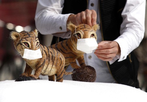 11月10日,北京迎来第二场大雪天气,栩栩如生的头发丝“老虎”被戴上口罩,提醒市民在寒流中注意抵御“甲流”疫情。这对“老虎”是北京青年理发师黄鑫用2.6公斤碎头发制作而成,历时两个多月的时间方才完工。中新社发 郑雄增 摄