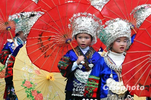 11月10日,“2009中国雷山苗年”庆祝活动在贵州省雷山县举行,当地小朋友身着苗族传统盛装走上街头,喜迎佳节。中新社发 侯宇 摄