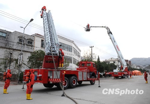 消防官兵在连云港市宿城乡演习现场对房屋举行去污消洗。中新社发 耿玉和 摄