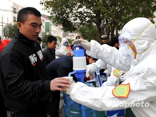医疗救护人员在连云港市宿城乡向公众发放碘片。 中新社发 耿玉和 摄