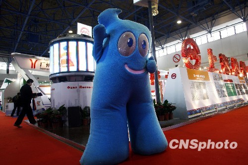 11月11日,世博会吉祥物“海宝”在北京国际城市轨道交通展上推介上海轨道交通新技术。来自国内外210多家城市轨道交通建设、运营管理、装备制造、施工、咨询、科研和设计企业参加了此次展会。中新社发 郑雄增 摄