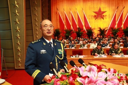 11月11日,“庆祝中国人民解放军空军成立60周年”大会在北京隆重举行。图为中央军委委员、空军司令员许其亮在庆祝大会上发言。中新社发 谭超 摄