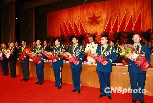 11月11日,是人民空军成立60周年纪念日。当天,“庆祝中国人民解放军空军成立60周年”大会在北京隆重召开。图为为空军英模代表颁发“空军英模纪念章”。中新社发 谭超 摄