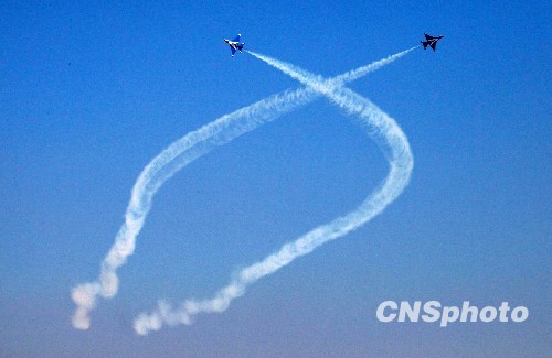 中国空军成立60周年纪念日进行首场飞行表演训练。中新社发 卢炳广 摄