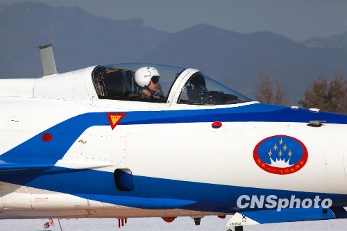 图为八一飞行表演队歼七飞机升空。中新社发 卢炳广 摄
