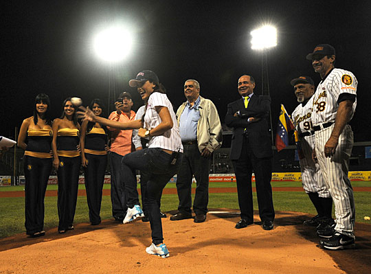 图为委内瑞拉环球小姐为棒球赛开球瞬间。