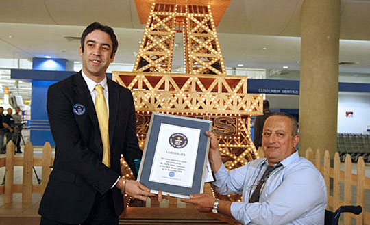 11月11日,在黎巴嫩首都贝鲁特一家购物中心,一名吉尼斯世界纪录的工作人员将证书交给黎巴嫩残疾艺术家图菲克·达希尔。达希尔以巴黎埃菲尔铁塔为原型,耗费4年时间,用600万支火柴棍和6000余只小灯泡制成一座高6.53米的火柴棍塔,从而创造了一项吉尼斯世界纪录。