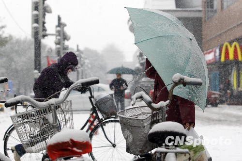 11月12日,北京迎来强降雪天气,市民冒雪出行,交通受到一定影响。