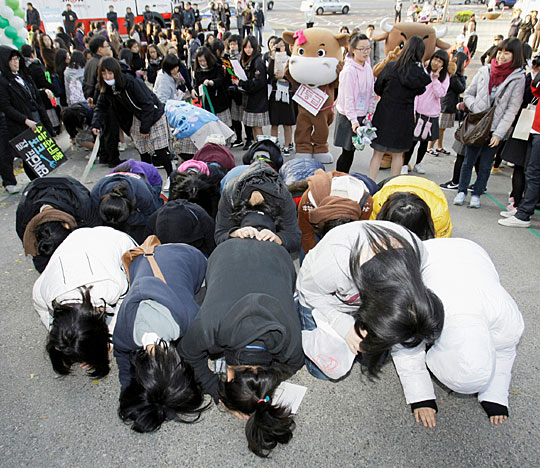 图为考场外韩国学生祝祷希望自己能考上好的大学。