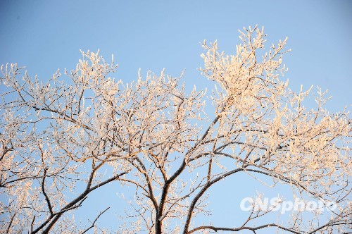 中俄界河黑龙江黑河段雾凇景观,成为中俄边城初冬一道靓丽风景。中新社发 邱齐龙 摄