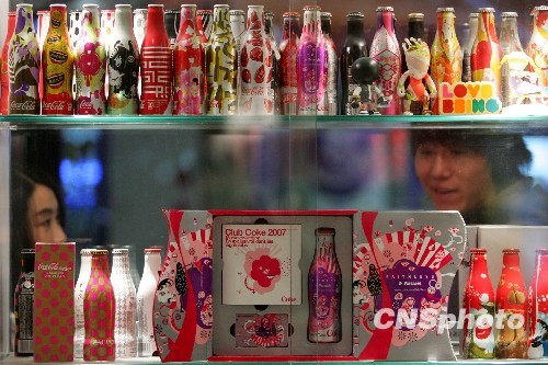 近日,北京某商场集中展示了六百多个可口可乐罐瓶,这些珍贵的藏品都是来自民间收藏可乐的爱好者。活动为“罐友们”提供一个展示平台,分享收藏喜悦。中新社发 富田 摄