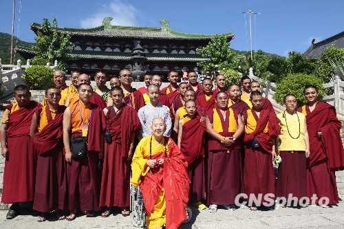 11月12日,西藏自治区活佛参观团一行30多人抵达海南三亚参访南山寺,并与南山寺方丈新成大和尚等僧众进行文化交流。该参观团主要由西藏20多所寺院选派26活佛代表组成。图为活佛和南山寺方丈新成大和尚合影。中新社发 陈文武 摄