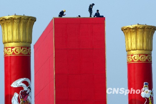 11月13日,位于天安门广场的四块巨型液晶显示屏开始拆除,这四块液晶显示屏在完成建国六十周年大庆任务后走下了舞台。据工作人员介绍,拆除工作从当日凌晨开始,全部移走要到下周一凌晨左右。中新社发 刘震 摄