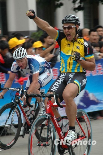 11月13日,2009年环海南岛国际公路自行车赛进行第三赛段兴隆至文昌的比赛,来自乌克兰国家队的车手余利尔·梅特鲁什科(中)以3小时36分06秒的成绩夺得赛段冠军。图为余利尔·梅特鲁什科挥拳振臂庆祝胜利。中新社发 尹海明 摄