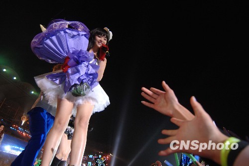 11月14日晚,快乐女声扬州演唱会在江苏扬州体育场震撼上演。2009“快乐女声”十强选手江映蓉、李霄云、黄英、郁可唯、刘惜君、谈莉娜、潘辰、潘虹樾、曾轶可、李媛希悉数登场,为现场观众带来数十首经典曲目,引爆全场。中新社发 陈中秋 摄