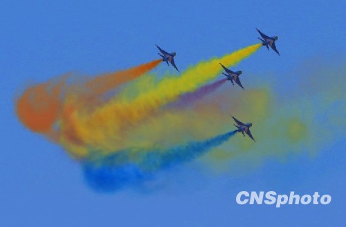 庆祝中国人民解放军空军成立60周年飞行表演,11月15日上午在北京沙河机场举行。表演按八一飞行表演队4架歼-10飞机表演12个动作和6架歼-7GB飞机表演15个动作,分四机对头交叉、四机菱形队大坡度盘旋、单机小速度平飞等27个动作,其中四机对头交叉动作是这次表演中技术难度较大的动作之一,这是国产三代飞机和国产二代飞机首次同场竞技表演。图为歼-7GB飞机表演。中新社发 宋吉河 摄