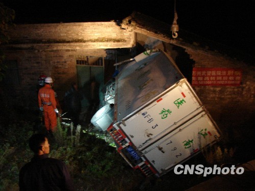 11月14日, 一辆小货车在从重庆云阳县南溪镇返回该县高阳镇途中时,与迎面行驶的一辆摩托车相撞后冲下公路坎下的居民楼房内。摩托车驾驶员当场死亡,货车驾驶室3人重伤并受困。 云阳县消防大队接到求救报警后,迅速出动一辆抢险救援车、9名消防官兵赶赴事故现场,把受困者成功救出并送到重庆三峡中心医院抢救。 中新社发 光之影 摄