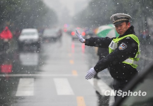 11月15日晚至16日,江苏省扬州市普降小到中雪,气温骤降,降雪给市民出行带来不便。扬州市交通、医疗、环卫等部门已启动应急预案,全力疏导保畅通。中新社发 王卓 摄