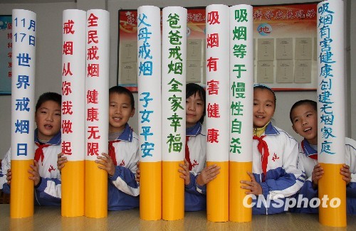 11月16日,山东省枣庄市薛城区实验小学的学生用旧挂历、报纸等“造”出一支支“香烟”模型,写上“父母戒烟 子女平安”、“爸爸戒烟 全家幸福”等语句,以此来劝告吸烟的家长戒烟。