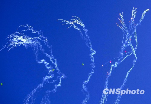 庆祝空军成立60周年跳伞表演犹如仙女散花。中新社发 宋吉河 摄