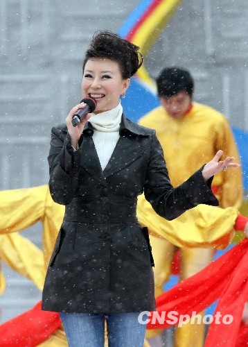 图为歌星祖海在雪中为河南两万工人演出。中新社发 陈代述 摄