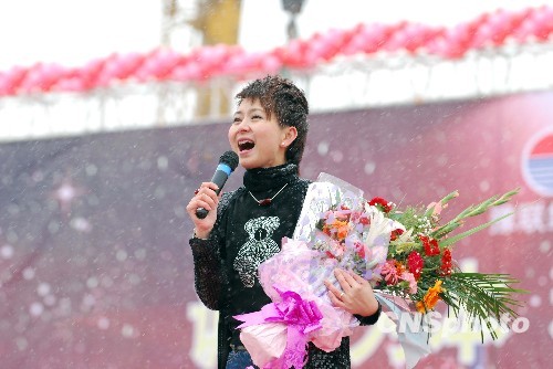 图为歌星甘萍在雪中为河南两万工人演出。中新社发 陈代述 摄