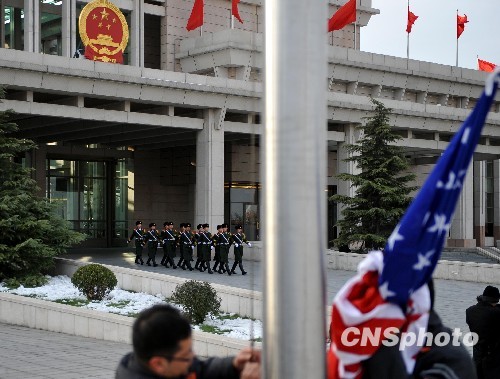 11月16日,北京首都机场新专机楼礼兵陆续就位迎接即将飞抵北京的美国总统奥巴马。中新社发 廖攀 摄